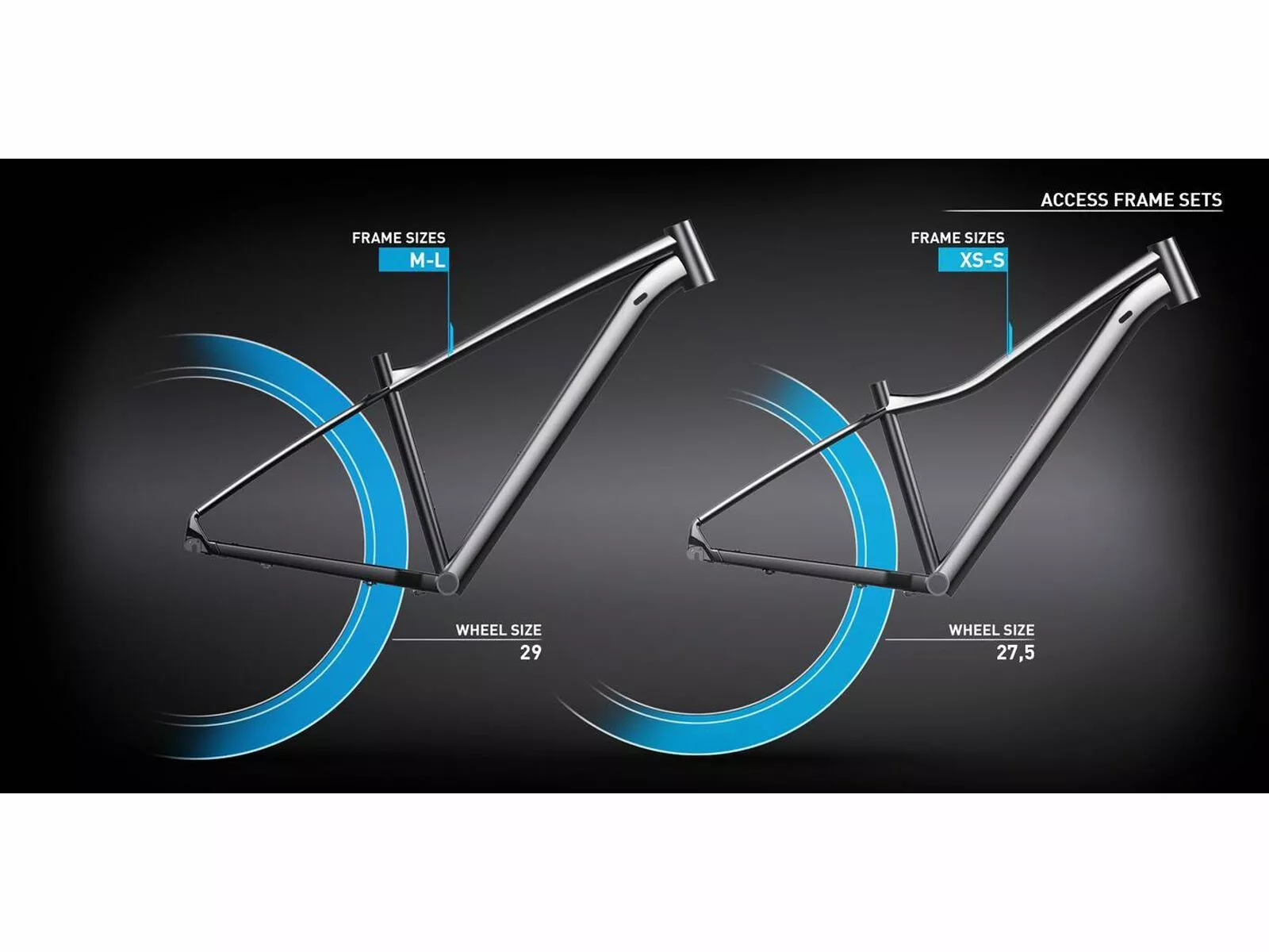 - Das Bike kommt je nach Rahmenhöhe in unterschiedlicher Laufradgröße: 27.5 oder 29 Zoll; so passt es perfekt zu deiner Körpergröße und deinem Fahrstil. Beachte bitte: 27.5 Zoll Varianten kommen mit leicht abeknicktem Oberrohr, die 29 Zoll Varianten mit geradem Oberrohr.